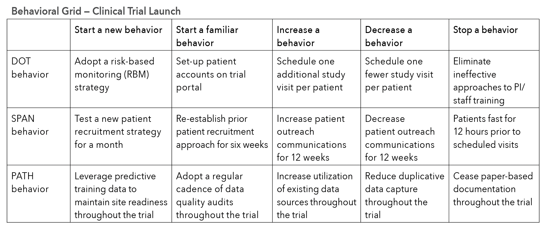 As an example, our team at ArcheMedX has generated a behavioral grid characterizing what some common shades of change might look like as you begin to launch a clinical trial (see Table 1). We capture blended behaviors from the sponsor, contract research organization (CRO), site, and even the patient to help paint the broadest picture.